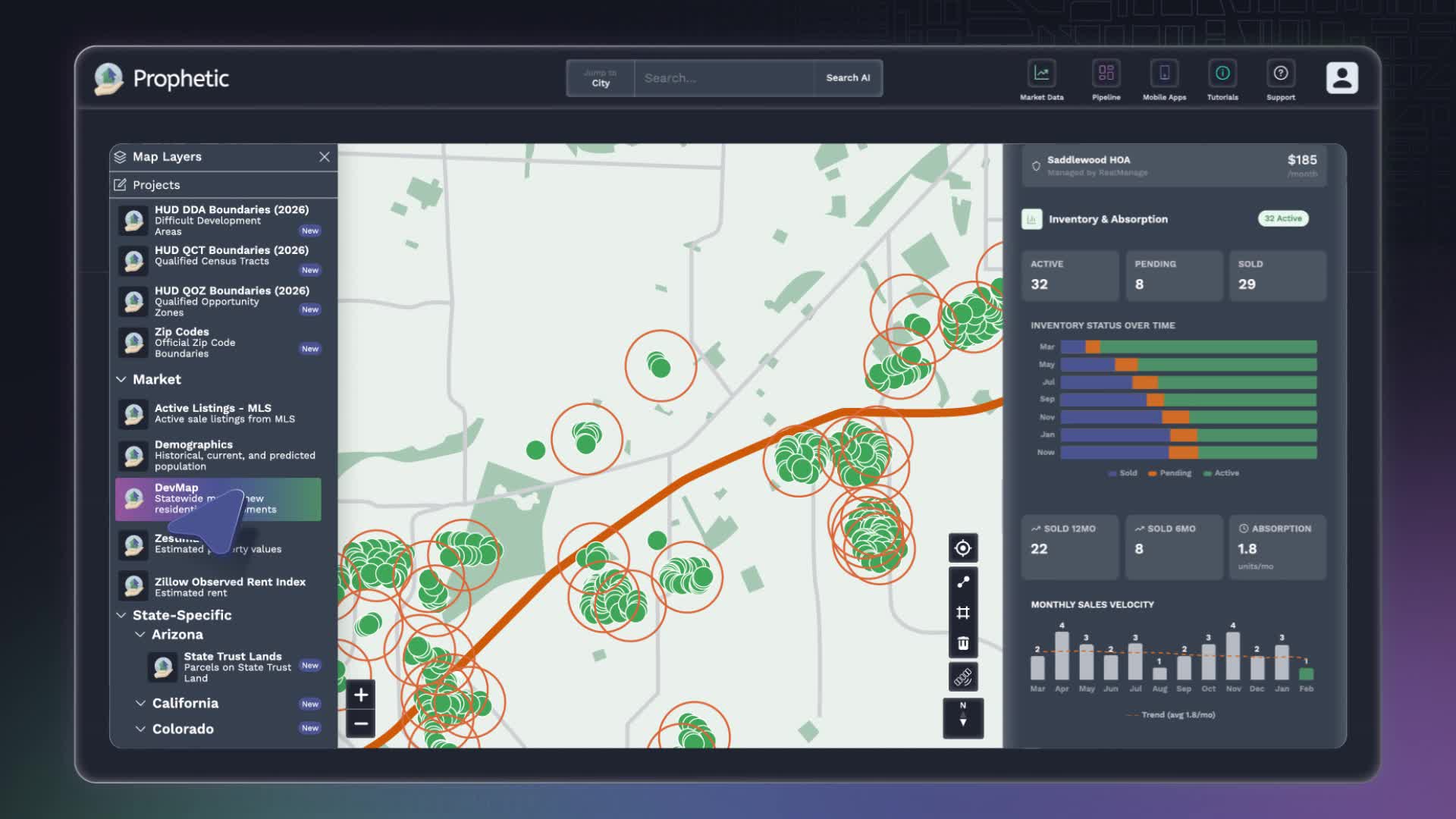 DevMap™ tracks projects from entitlement, months before competitors even know they exist. See what's being built, how it's performing, and where markets are heading before purchase.