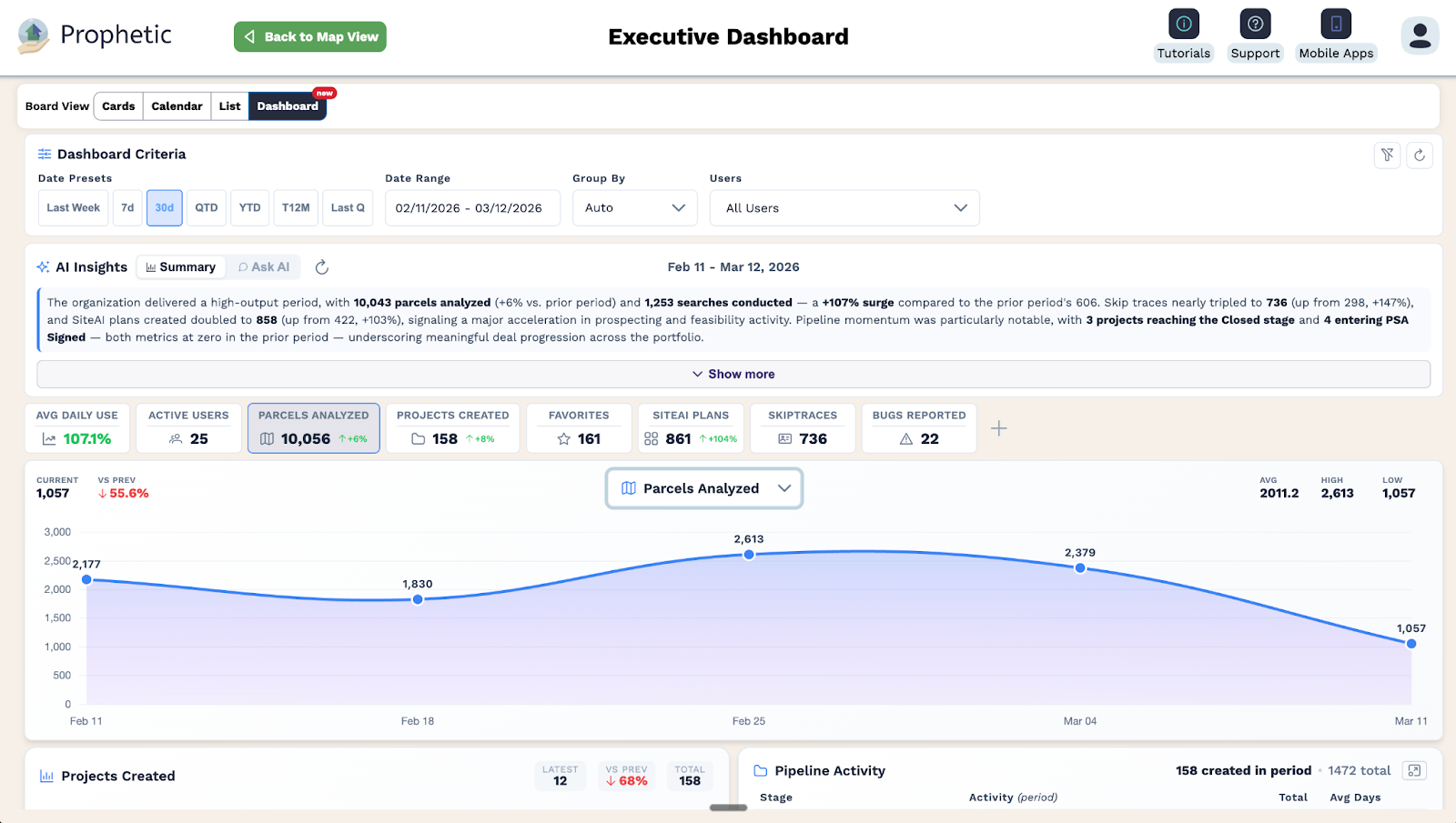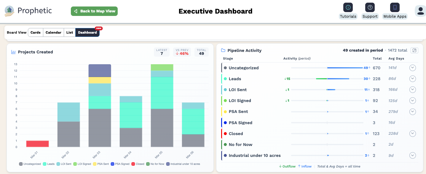 The data powering the Executive Dashboard is not new. Every search run, every project stage change, every parcel analyzed and landowner contacted has been captured inside Prophetic from day one. The Executive Dashboard surfaces that data in a structured, role-aware format with AI on top, so the picture your teams have been building every day is finally available to the leaders directing where they go next.